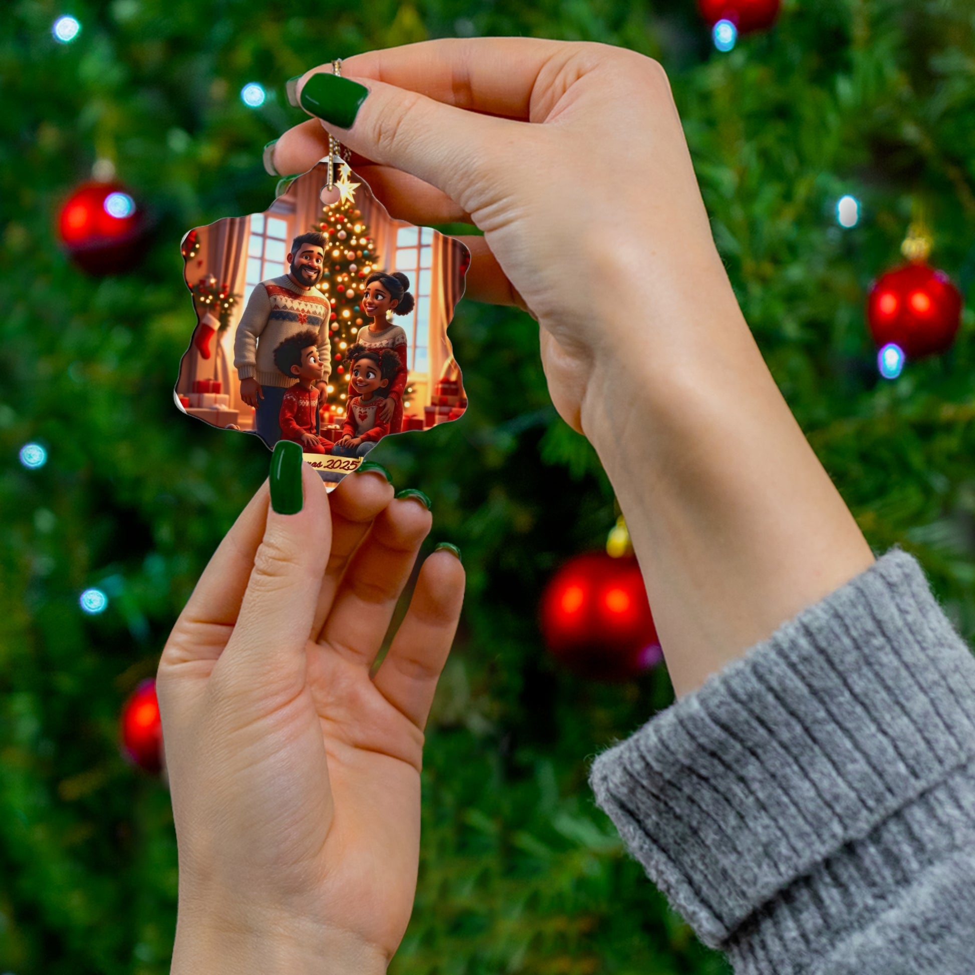 This ceramic ornament features a black family with a father, mother, and two children, perfect for celebrating family unity. The vibrant colors and glossy finish make it a beautiful addition to any holiday tree. Ideal for those looking for a unique and heartwarming ornament to cherish for years to come. Relevant for Christmas, Kwanzaa, and other family-oriented celebrations.