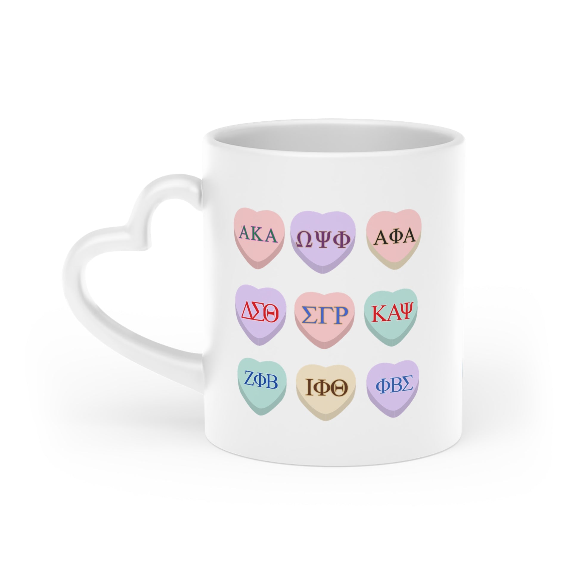 Shop this unique D9 conversation hearts mug, featuring Greek letters designed for your favorite Divine Nine soror or fraternity brother. Perfect D9 paraphernalia & BGLO gift for Valentine's Day or everyday use.