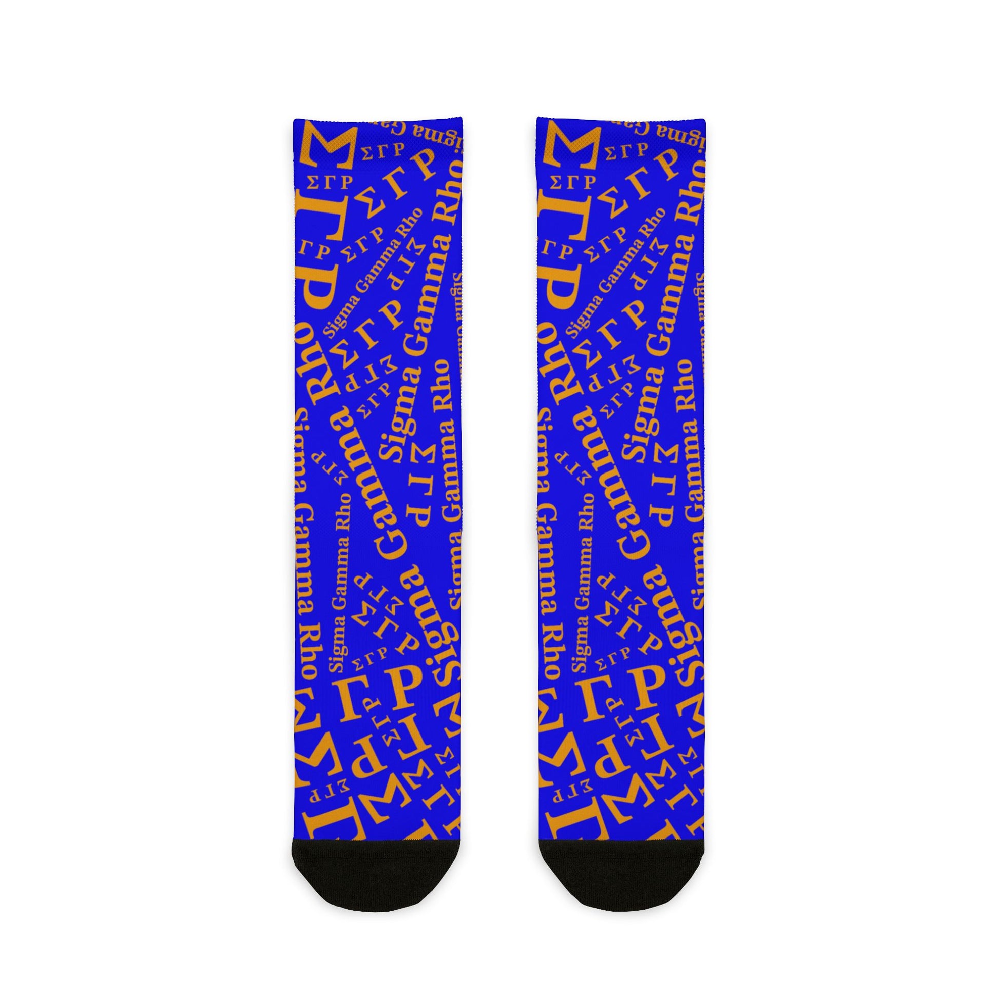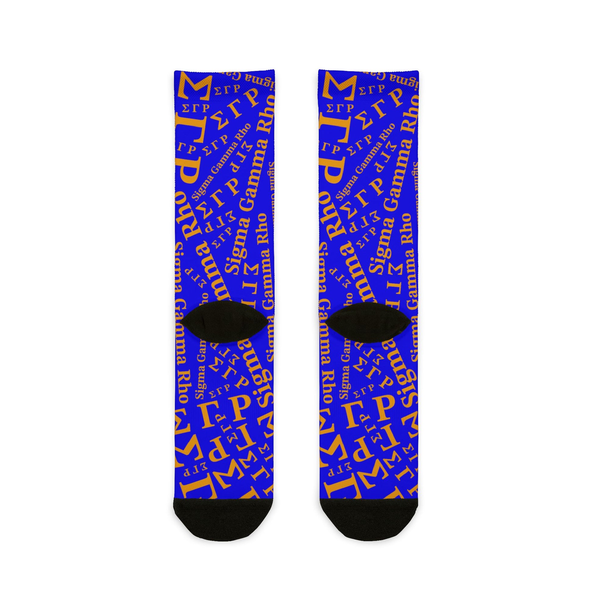 ΣΓΡ | Greek Letters Pattern | Paraphernalia | Gift Sigma Gamma Rho Blue & Gold Word-Cloud Crew Socks — Custom Sublimation
