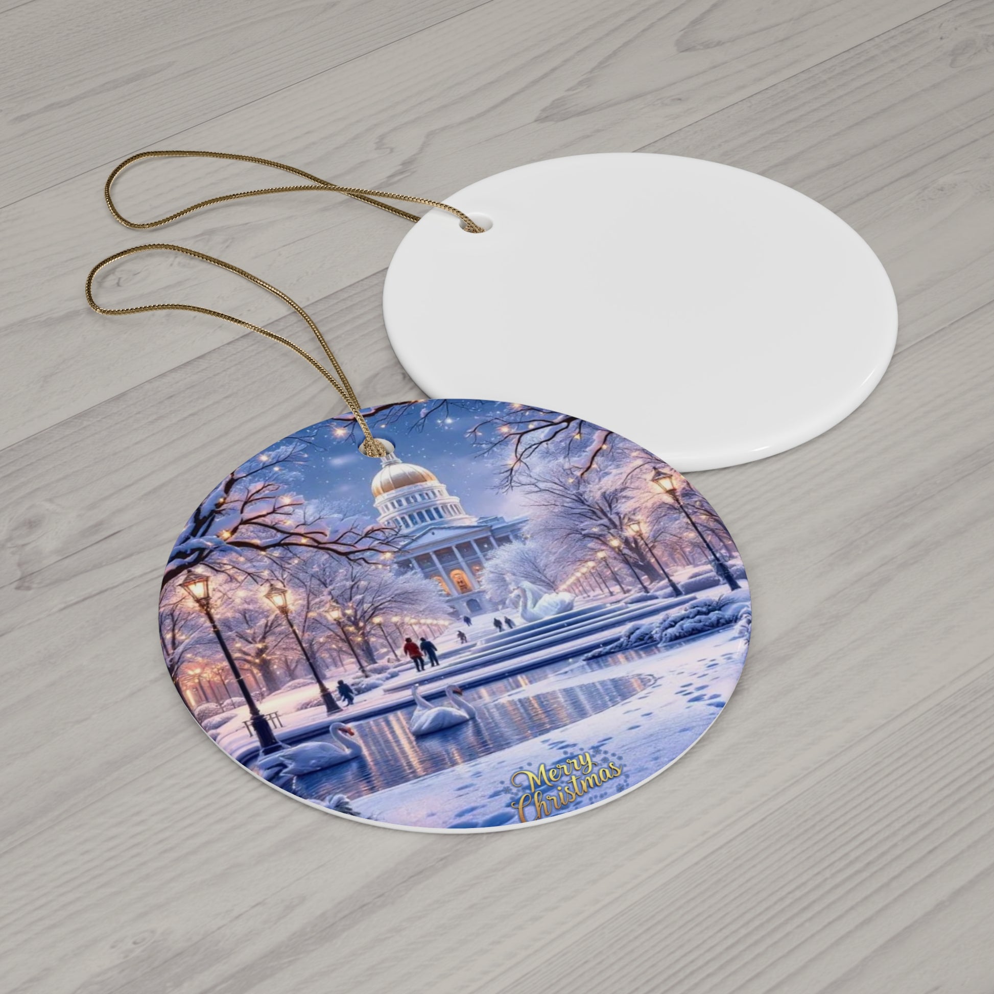 Bring the magic of Washington DC at Christmas into your home with this beautiful Ceramic Ornament featuring the White House in a snowy scene. Perfect for decorating your Christmas tree and adding a touch of holiday spirit.